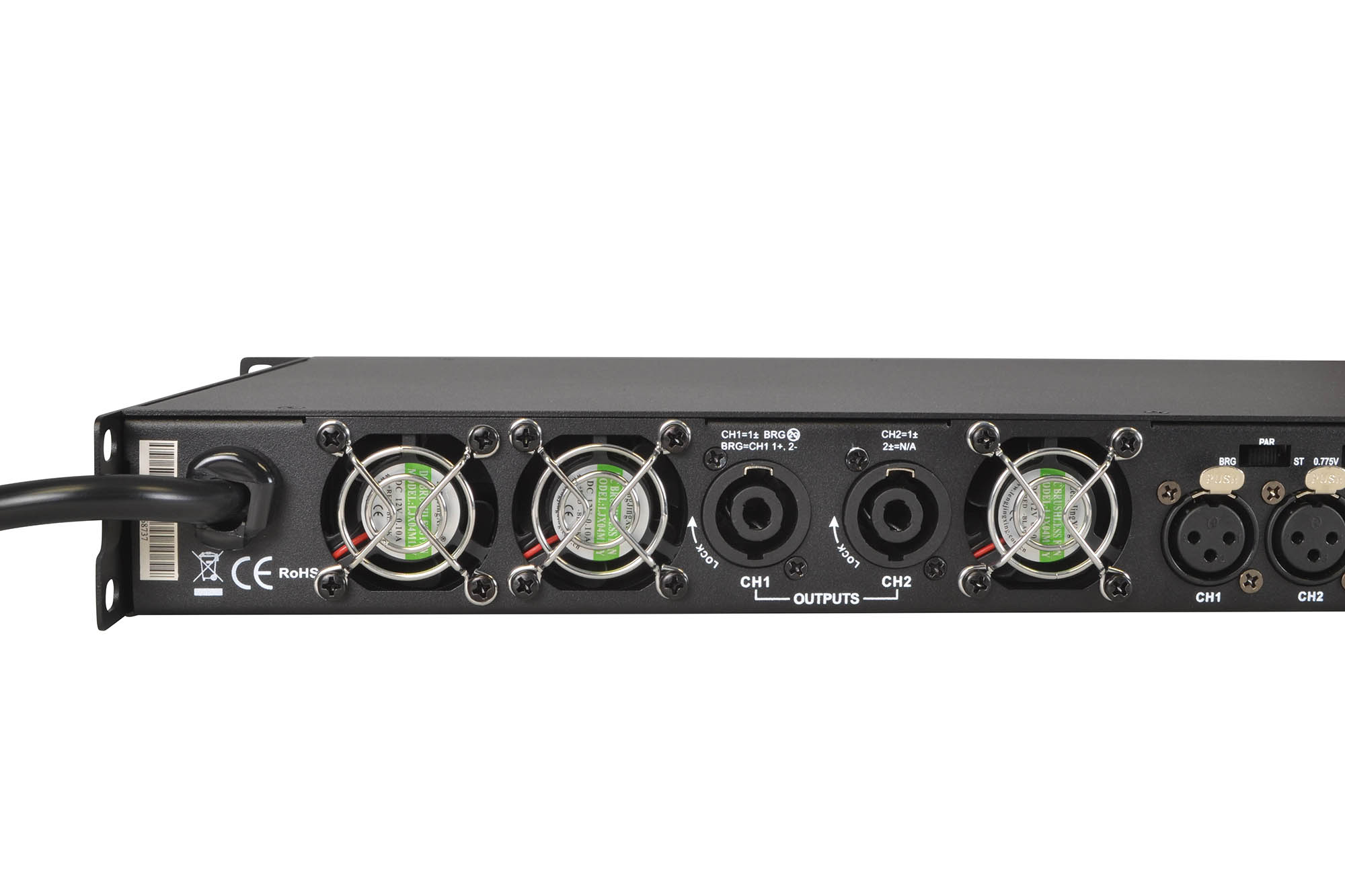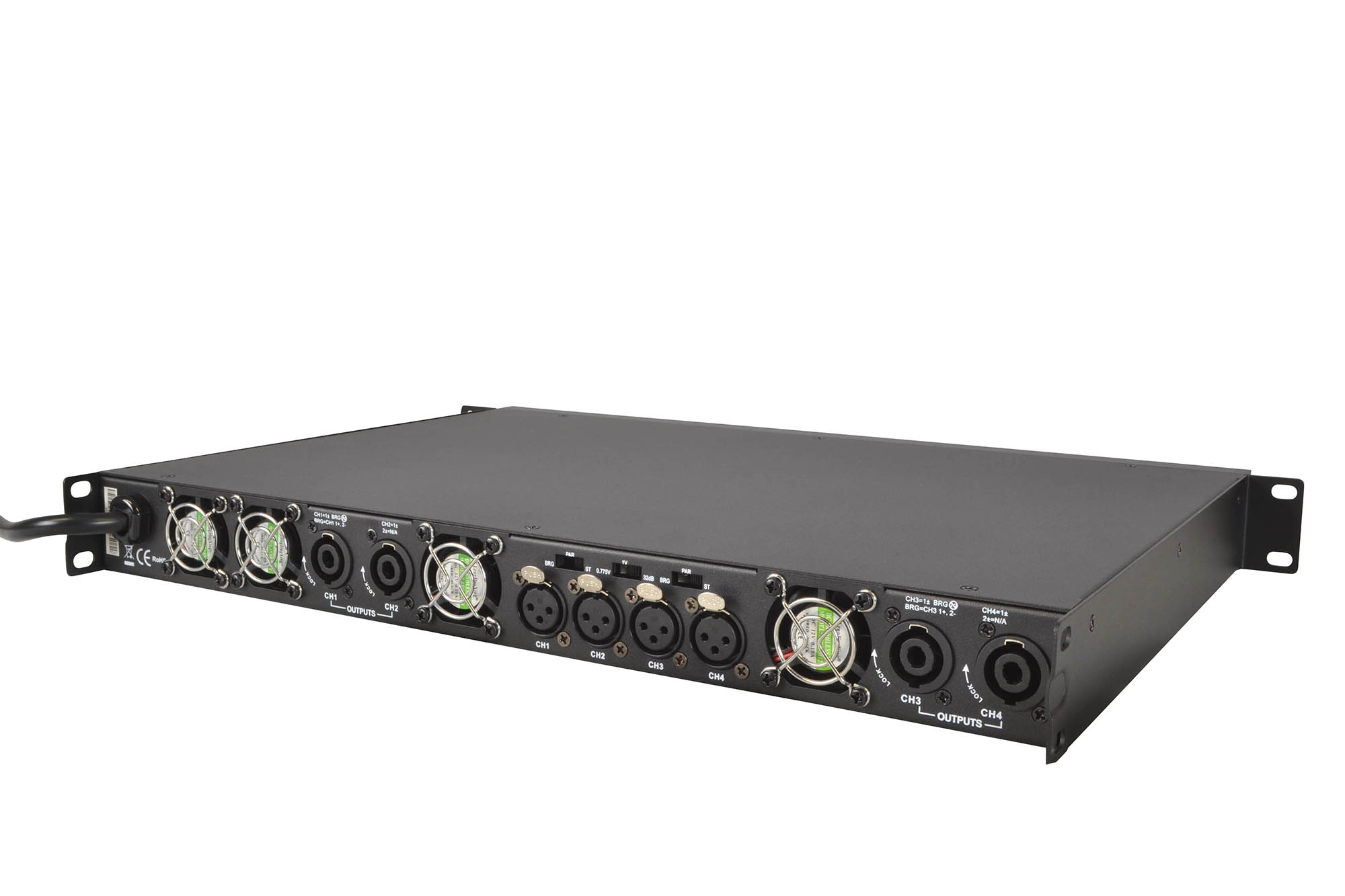 Input sensitivity can be set to 0.775 V, 1.0 V, or 32 dB, ensuring compatibility with a wide range of signal sources and system processors. Connectivity includes balanced XLR inputs for each channel, with link outputs provided to allow straightforward signal routing and system expansion. Speaker outputs are delivered via robust Speakon connectors for secure, professional-grade connections.