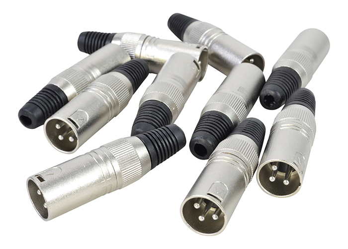 A pack of 10 3 pin male XLR connectors suitable for making audio and lighting connections.