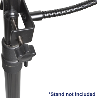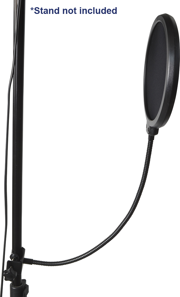A handy pop filter which helps reduce P and B and other popping sounds when recording in a studio. This pop filter has a fabric mesh stretched in a strong plastic case, this is attached to a goose neck which allows the use to bend into the perfect position. This pop filter can be attached to most microphones stands via the screw clip.