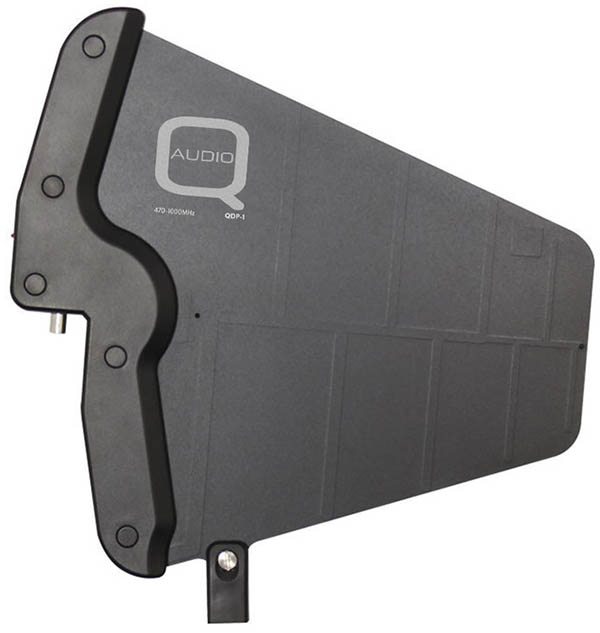 This is a UHF wideband antenna splitter designed for use with up to four radio microphone receivers. It features a dual 1:4 configuration, making it suitable for up to four diversity receivers and allowing two Q-Audio active antennas (QDP1) to be used across multiple receivers. This setup helps reduce intermodulation and minimizes RF signal dropout.
